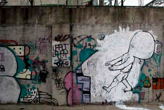 Which direction? Into the weird! It’s true - ‘Muto’, unlike ‘Big Bang Big Boom’, doesn’t necessarily have a plot or storyline with a moral to share. ‘Muto’ is more or less the crazy journey of Blu characters which morph and transform as they travel along walls, under bricks, through yards and indoors. We’re not sure whether the title ‘Muto’ refers to change (as in ‘mutate’) or possibly the Italian for silent, ie: ‘muto’. It could go either way, as the characters don’t speak and sure as nuts do a lot of mutating. Silent mutation, maybe? Blu knows, but he’s not telling - and you couldn’t ask him either, as he keeps his real identity pretty well hidden.