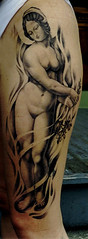 I have often wondered what makes a tattoo design a tattoo design*…and with that being said, what makes a *t-shirt design a t-shirt design. I watch tons of tattoo shows and I often find myself gravitating towards anything tattoo related on the web. I decided to use this passion to actually answer my own question. Veteran tattoo artist Corey Miller once said in Season 1 of the hit TLC show LA Ink that not everything someone envisions for their tattoo is actually tattooable. I recall a guy bringing in an intricate design to Corey and Corey then decided to make it more of a tattoo than a t-shirt design. By no means does this mean that tattoos aren’t detailed or realistic but he acknowledges what points of a sketch make for good vs. a great tattoo. Kore Flatmo is one of thee most amazing tattooist I have seen, his fine lines, black and grey, and portraits are just so incredibly realistic that you often wonder how the hell someone could do that with a vibrating needle and some ink. I have seen some of his work and man it’s not hard to see why he has the reputation he has. See this one he did some time ago of the late Sharon Tate (remember her; she was the pregnant actress who was murdered by the Charles Manson crew). See it here along with some other work of Kore’s: