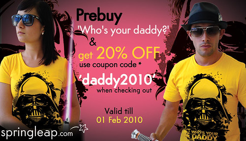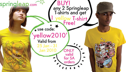 Two MAJOR sales are currently running on our site. Here’s what they’re all about…Become a Springleap registered user for FREE to be the first to know about our NEXT sale! Special #1: Who’s your daddy? Pre-buy means the tee hasn’t been printed yet, so your order will only be sent to you once it is in stock. Good news is that you’ll be one of the first people in the world to own it! ;) Take me to the ‘Who’s your daddy?’ t-shirt. Special #2: Buy 2 get a yellow tee FREE! Choose 3 tees, one must be yellow…that’s the one we will give you FREE! REMEMBER |