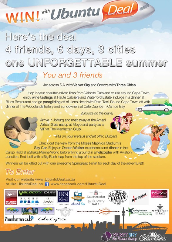 South Africa's Group buying site, Ubuntu Deal, has teamed up with a host of amazing companies to bring you a prize that will make all of your past holiday getaways look like a trip to the dentist in comparison. Springleap.com has also gotten involved and will give each of the 4 lucky travellers 1 of our super cool t-shirts for each day of the trip. Yep, that’s 6 tees each….very nice indeed! The winners will enjoy an exhilarating once in a lifetime trip, experiencing the very best that South Africa has to offer. Wine, food, dancing, adventure….you will enjoy all this and so much more. All you need to do to enter is visit www.UbuntuDeal.co.za or simply ‘like’ their Facebook page and follow the instructions. Easy and oh so worht it!
