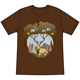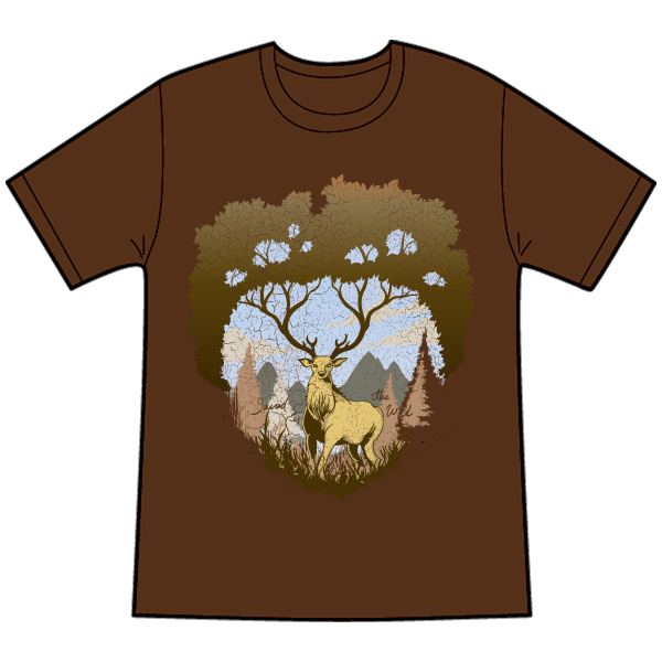 I wanted to do a design that reflects beauty in nature. A deer whose antlers morph into tree limbs to reveal a leafy canopy above. With a colorful landscape of rolling mountains and speckled trees what nature lover wouldn’t adore this on any shirt. The words “Sacred is the Wild” lightly across the design it is sure to attract all ages. The wonderment of the wild is a tireless theme that can be used again and again.