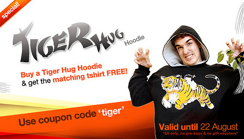 In perhaps the strangest story I’ve heard in a while, a tiger has escaped his owner’s bakkie by opening the canopy and taking himself out for walkies. The tiger was allegedly being taken to the vet for treatment when he escaped the vehicle. He was last seen in the Delmas area. Every reasonable person surely knows that the vet should have gone to visit Panjo, not the other way around. How crazy do you have to be to stick a tiger in the car and go for a drive?? Anyway,there have been a few “sightings”, although a spokesperson from the SPCA confirms that one sighting was, in fact, not the tiger, but rather a very large dog. Hmmmm…. Now- in case you happen across this predator- be warned. If he has been hurt during his escape, he could be wild and aggressive, in which case you’re pretty much screwed. However, if he is ok and he jumps up, a simple but firm “NO!” will cause him to back off- according to the owners, Panjo is very well-trained. So well-trained, in fact, that he was able to open the canopy of the bakkie without the use of opposable thumbs. So Springleapers- to up the stakes a little, we are offering the person who finds Panjo a very unique prize- 1× Tiger Hug Hoodie by Colwyn
