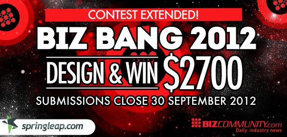 RULES: 1. No obscenities or hate speech. 2. Only original works will be accepted. 3. Designs should incorporate the Bizcommunity logo. 4. Designs must be suitable for a white, grey or black background. 5. Each designer may submit up to five (5) designs. 6. Final winners will be chosen by the Springleap design panel, in conjunction with Bizcommunity. Voting will only be used as an indication. 7. Standard Springleap and Bizcommunity Terms & Conditions apply over and above. 8. Bizcommunity operates independently from Springleap.com and all commercial transactions completed through Springleap are in no way linked to Bizcommunity. All queries relating to this contest and the website should be directed through Springleap.com 9. Bizcommunity and Springleap reserve the right to request the high-resolution artwork of any entry submitted into the “BIZ BANG 2012” design contest for non-commercial benefit, such as media covering the process. 10. The contest will run from 01 August 2021 to 30 September 2012. Winners will be chosen by a panel from 03 September to 30 September 2012. Final winners will be chosen and announced on 08 October 2021 via the Springleap.com website, Facebook page and Twitter account, as well as the Bizcommunity website and Facebook page. The winning designs are final and no correspondence will be entered into. 11. Prizes are not transferable. 12. All designs submitted outside office hours, over weekends and on (South African) public holidays, will take longer to approve 13. All dates and times presented are based on GMT+2 times.