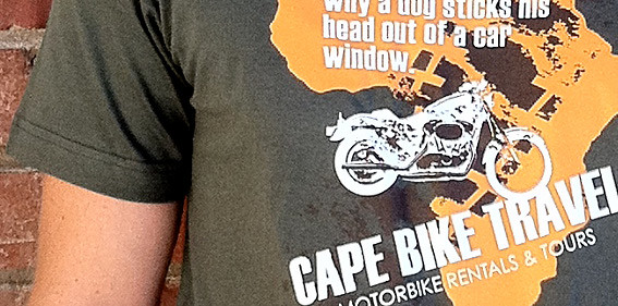 The feeling of the open road , the wind in your hair, the freedom it brings…nothing can compare! Cape Bike Travels is a well known bike rental and tour operator based right here in Green Point, Cape Town . We were delighted to work with a company that has a very similar ‘feeling’ to Springleap. While Springleap is all about creative freedom, Cape Bike Travels is all about the freedom that can only be achieved by cruising around the fairest Cape on the back of a roaring motorcycle . I love the copy for this design: Only a biker knows why a dog sticks his head out of a car window .